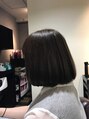 あごレングスの重めのボブです。前髪はぱっつんで全体的に重た目にこだわったスタイル。カラーは10レベルのマットベースで赤みを出さないように仕上げてます。