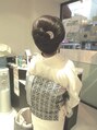 ガッツリ下めのシニヨンスタイルにして、後頭部はボリュームを出して丸いシルエットにしました。フロントはやや高めに立ち上げて、片目がかかるかかからないかぐらいで流しました。