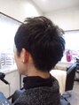毛量が多いので、サイドと襟足をすっきりと。トップはクセを活かして動きのあるスタイルに