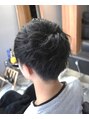 まわりは刈り上げてツーブロックに。全体少し長さを残して、フロント以外にウィ―ビングパーマをあててナチュラルなパーマ感をだしました。初めてのパーマにおすすめ!ビジネスマンもOKなスタイルです!