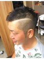 サイド~バックは4ミリで刈上げ。トップはソフモヒベース。全体短くして、フロントからサイドにかけて1本の太いラインで男気を出しました。ツーブロックに飽きた人におすすめのソフトモヒカンベースのおしゃれボウズスタイル