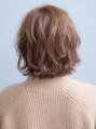 裾の毛先と表面は全体にパーマをかけてふんわり感をだしたパーマスタイルです。顔まわりにかかる髪を多めにして甘い雰囲気をアップ。カラーも肌を明るく見せるベージュ系。今のシーズンにぴったりのスタイルです。