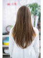 ストンとした流れるような縦ラインと顔周りのレイヤーでグラマラスな雰囲気に仕上げた美ストレート。ノーバングで顔だちをスッキリ見せて、媚びない大人カッコイイレディに格上げ。かきあげも似合います。センターパートでエキゾチックにしてもオシャレ。