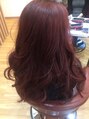 スタイル抜群の彼女には、可愛すぎるよりかっこいいロングのスタイルに。コーラル(レッド系)でゴージャスにコテで仕上げます。