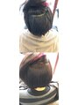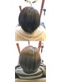 ショートボブのストレートパーマです。ツンとなりすぎない感じが良いのですね!今回はヘアカラーも同時進行、3時間弱で終了しています。カラーも活性酸素発生を抑えた優しいものです。