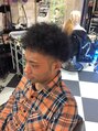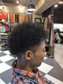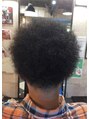 サイド~ネープを刈り上げ、ベースカットした後ハードツイストパーマをあてます。OFF後に完全ドライしながらツイストをほぐし粗目のくしでときながらアフターカットで丸みを作れば出来上がり!!
