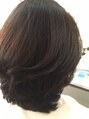つむじがわれやすい方などトップを適度な長さにしてふんわりパーマをかけました。トップは短すぎても長すぎてもうまくいきませんので、一人一人の毛流れを見ながら調整します。前髪も長めにして横に流したのでよりエレガントなスタイルになりました。