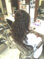 トップを高めにふんわり盛り両サイドを編込みにして、バックでクロスし、しっかりミックス巻きにしました