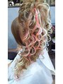 ダブルカラーで明るいベージュでそめてエクステを地毛とピンクと白をつけてからハーフアップセットしています。