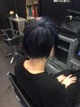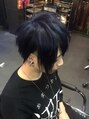 えりもとスッキリの前下がり、トップにレイヤーで動きを!カラー、ブリーチ1回に黒に近い青、環境の明るさで色味の出方が変わります☆カラー剤はカラートリックを使用!