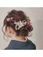 ウェーブ、ツイストでローウエイトにまとめたアレンジに、リボンと生花を散らして華やかに!!結婚式や、二次会、パーティー、花火大会、浴衣にもおすすめです!!