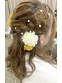三つ編み、ロープ編みを取り入れたハーフアップアレンジロープ編みの編み目にパールピンを刺す事によりより華やかなスタイルに変わります。