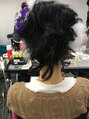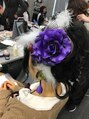 全体にカールをつけ高めのポニーテールで華やかにかつスッキリしたアレンジスタイルです。
