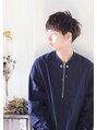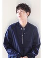 マッシュベースのツーブロックショートスタイル。パーマは、毛先が無造作に動くようにゆるく髪全体にかける。カラーリングは、7トーンのブルーアッシュを入れて透明感をプラスして柔らかな髪質の印象に仕上げます。