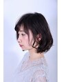 前下がりのナチュラルボブベースに無造作なカールをプラスしたボブスタイル。斜めバングに&耳掛けアシメ風で大人可愛い雰囲気に。