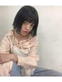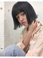 あごラインの前下がり切りっぱなしボブ。顔立ちに合わせてタイトな仕上がりになるように内側の毛量調節をしています。カラーはブリーチ2回ベースにネイビーグレーでグラデーションをつくりました。