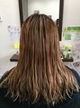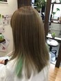 全体ブリーチのベースにさらにブリーチでハイライトを入れて、モノトーンで染めてグレージュに。サイドにはブルーとグリーンのインナーカラーを入れました。