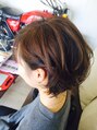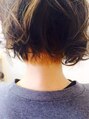 やわらかいボブラインをあえてアシメスタイルにして個性的な仕上がりにもできるようにしました。写真はコテ巻きでかわいらしい女性らしさを出したパターンです。バックにインナーカラーでハイライト、アクセントにローライトも・・