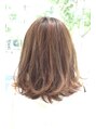 鎖骨ラインのミディアムカールスタイルです。カットはシンプルなワンレングスですが顔まわりとトップにレイヤーを入れて動きが出るようにカットしています。アイロンで巻いた時にレイヤー部分にランダムな動きがつきます。