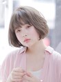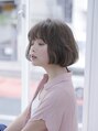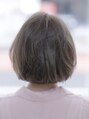 アゴラインのボブスタイル、トップのみ短くカットしてふんわりボリュームがでるようにしました。カラーはマットベージュで赤味をなくし透明感のある外国人風、毛先にな内巻きになる程度の弱めのパーマで顔を包み小顔の印象にしてくれます。