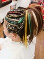 カラーエクも一緒に編み込む事によってコーンロウもより引き立ちますね!夏のイベント事にもってこいなスタイルです☆