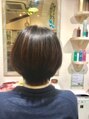 前下がりのグラボブです。襟足をV字ラインにすることで首が細く見えすっきりみえます。前下がりのの段を入れることにより日本人の絶壁を骨格カバーできます。顔がシャープに細く見えるスタイルです。