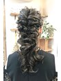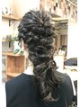 トップの髪を1つで結びクルリンパをして毛束をルーズに崩します。サイドの髪をねじりながら結び目が隠れるように交差させてピンでとめます。残った襟足のい髪をトップの毛束になじませるようにコテでカールをつけて完成♪