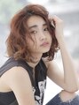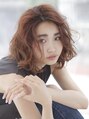 肩につく長さのボブスタイル。パーマを根元からボリュームがでるようにかけランダムに毛束が動くようにしてあります。カラーはオレンジブラウンで女性らしい柔らかい印象に、シルエットはAラインでお顔を小さく見せてくれるオススメのスタイル