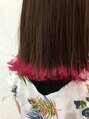 毛先5センチだけピンクのすそカラーグラデーションです。毛先は1回ブリーチで染めれます。表面はピンクと相性の良いスモーキーブラウンで染めてあります。カットは切りっぱなしのロングボブです。instagram→ hamaken5