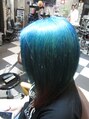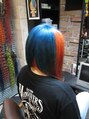 前回のカラーの残留で少し緑が残っていたので、ブリーチで根本のリタッチ、中間~毛先は脱染をして前回の色を削り(全部は取れないのでオレンジ発色できるぐらい)右サイド&インナーにオレンジ系、上はマーメイドブルー系をON!!夏の派手髪カラー。