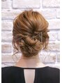 サイドをルーズにねじって下目のシニヨンにしました。シニヨンもルーズにまとめることで全体が柔らかいイメージに仕上がります。顔まわりを緩めに巻いて華やかに。