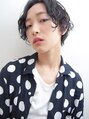 センターパートのグラデーションボブにやや強めのウェーブを施したスタイル。黒髪を生かすことでジェンダーレスな印象に。