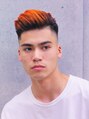 ビビットなオレンジと刈り上げで、ニューヨーカー風なイメージで。パンチの効いたストリートスタイルです。カラーはブリーチ2回にカラーをかぶせてあります。