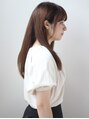 丸型・ベース型タイプの方は、アゴラインをシャープに見せるためトップからレイヤーを入れひし形のシルエットに導きます。前髪は、透け感のあるシースルーバングで顔の奥行きを出し、ナチュラルなストレートでもトレド感を抑えています。【青山/表参道】