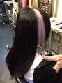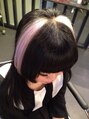 ポイントカラー。ブリーチを数回して、薄めの金髪まで明るくしたああとに、薄めのパープルで黄色みを消し。白っぽいお色に仕上げました。