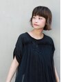 リップ下のラインで切りそろえたボブスタイルをアイロンで外ハネにスタイリングをしたスタイルです。所々にハイライトをプラスしてあります。