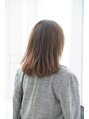 全体的な長さは鎖骨に設定しIラインになるようにしました。前髪は、チークラインで小顔と無造作に。似合わせカット。簡単スタイリング。カラーは、8レベルのアッシュブラウンで毛先は、ブラウン系のヘアマニキュア。透け感と、ツヤが出るようにしました。