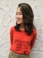 前上がりにカットしコテで巻きやすいように段を入れています。カラーはアッシュ系で表面と前髪にハイライトを入れて透明感と立体感がでるようにしています。