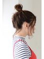 元気いっぱい!なイメージのお団子スタイル。こめかみ・サイド・バックの髪を残して手グシで髪をまとめ、あごの延長線上の高めの位置でラフなお団子をつくります。高さを作る事で丸顔の方もスッキリ見えるスタイルです。【EARTH海老名店】