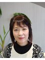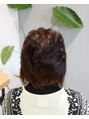 トップは10センチぐらいでサイド頬のラインまでレイヤーを入れバックも丸く膨らみが出るようにつなぎ、前下がりにカットします。すそのラインはかなりセニングし全体に毛先のみ軽く毛量調整しています。