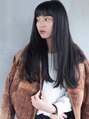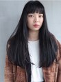 シンプルなストレートロングhair前髪は眉をラインでまっすぐにパッツン。全体は重さを残してブラントなパツッとラインわ、あえて残しています。ブラントなラインが外国人の様な雰囲気を醸し出します。カラーはダークでシアーなサファイアブルー。