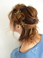 サイドパートで分けて両サイドそれぞれを耳後ろで、2回ずつくるりんぱ。後ろにも1回くるりんぱし、5回くるりんぱを使ったスタイル。金ピンを3本使いお花をイメージしたところがポイント。全体を少し崩すことで抜け感をプラス♪【EARTH三木店】