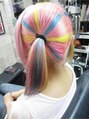 ツインテールをした時にメッシュがかわいく出るようにメッシュを入れました。カラーはブリーチ2回後ベースをベイビーピンク、メッシュをターコイズブルーと蛍光黄色にしました。