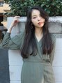 シンプルなロングスタイル。毛先はパツッとあえてブラント感を残して外国人風に。顔まわりは、顎ラインで表情を。シンプルなhairでも顔まわりにポイントをおくことで、グッと魅力的なhairになります。カラーは、透き通るベージュブラウンで柔らかさを。