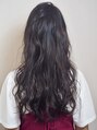 全体をネイビーアッシュでツヤ感を出しながら柔らかい雰囲気にそめめした。スタイリングは38ミリの太めのコテでランダムな緩めのウェーブをつけました。巻くのが苦手な人はパーマでも近いイメージが出せると思います。
