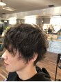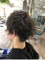 マッシュレイヤーベースのカットに全体を細かいスパイラルパーマを入れ黒髪だと重くなってしまうのでカラーをアッシュ系で染め柔らかさを演出斎藤工風な大人モテスタイル