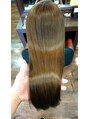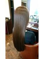 モデルのお客様は毎月カラーをしにご来店頂いているのですが、毎回お客様の髪質に合わせて配合するオージュアシステムトリートメントも施させて頂いていますので、この長さで毎月カラーをさせて頂いていても、この美しい髪をキープされていらっしゃいます。