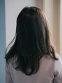 ゆるやかな前上がりのラウンドでカットしたセミロング。毛先が自然とまとまるくらいでグラレイヤー。トップはハチ上のブロックにハイレイヤーでふんわり感を出しています。全体が重めシルエットなので前髮に隙間を作り抜け感をプラス。