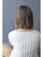 やや前下がりのシンプルなボブ。肩ギリギリの長さで着る事で外ハネにもしやすいヘアスタイルに。ベースを深めのグレージュにハイライトを透明感のあるライトベージュにした3Dカラーで立体感を。