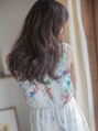 外国人風のきれいなグレージュカラーのロング。8レベルのモノトーンアッシュで抜け感のあるくすみカラーにしています。重ためにカットしたロングにゆるふわなくせ毛風ウェーブでかわいらしさアップ☆アレンジにもおすすめなスタイルです!